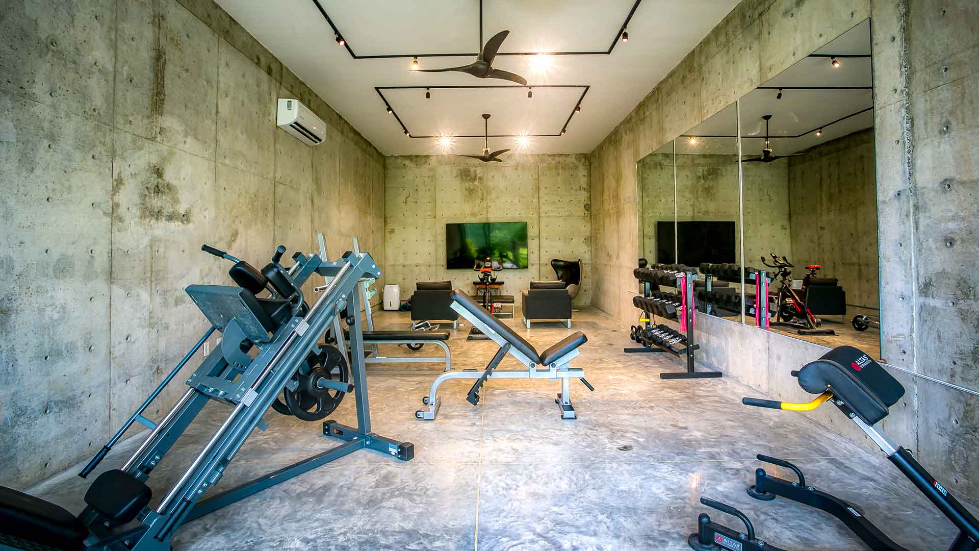 The private parking directs to the entrance level with an open-concept floor plan hosting the living area, dining room, ample kitchen and powder rooms, all leading out to the sprawling ocean view terrace with swimming pool. The staircase below the swimming pool leads to the professionally equipped, air-conditioned gym with a 65” TV. The upper level encompasses the three, private, air-conditioned, en suite bedrooms, two hosting king beds and one hosting two queen beds. The principal suite with king bed is separated by the atrium for total privacy.