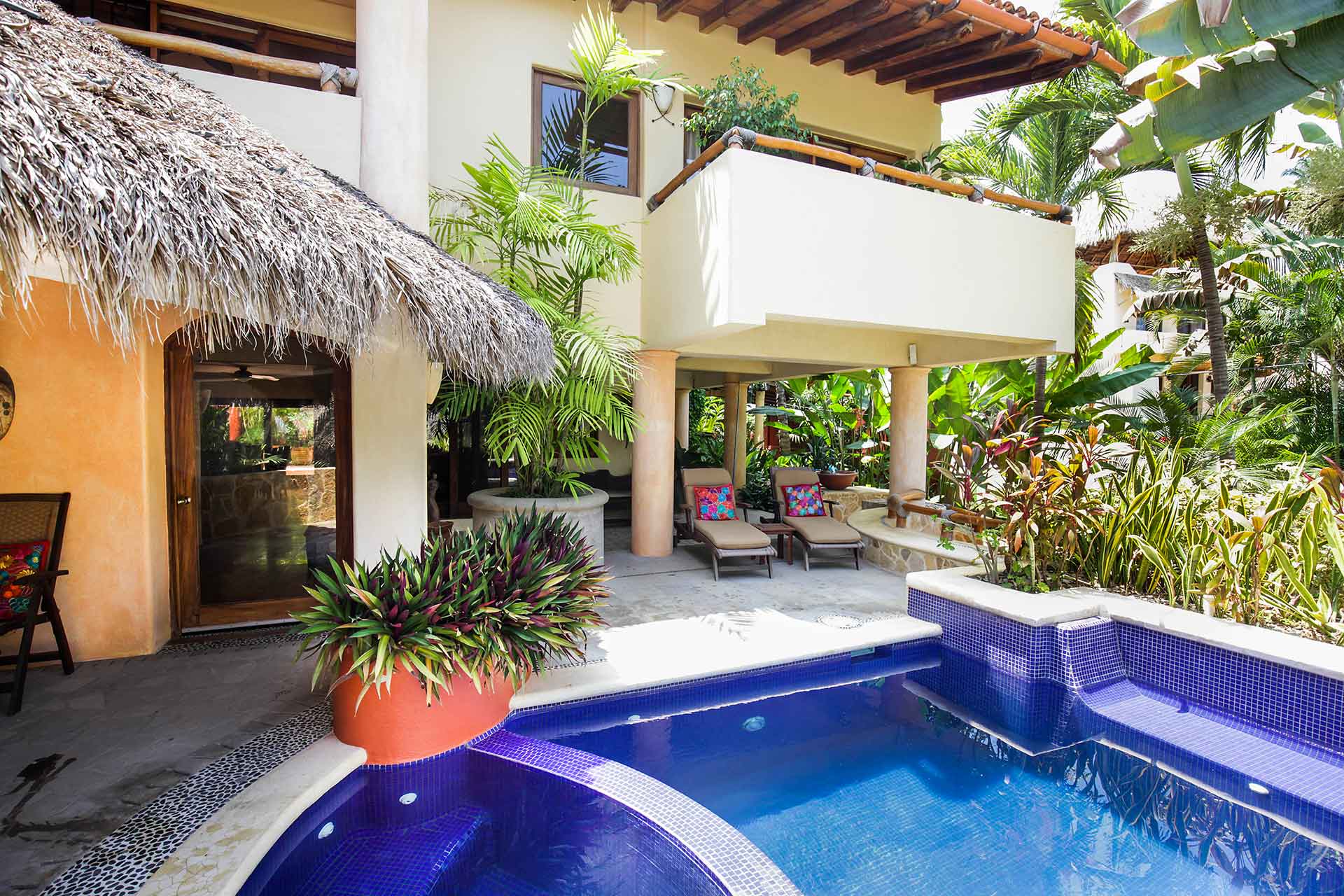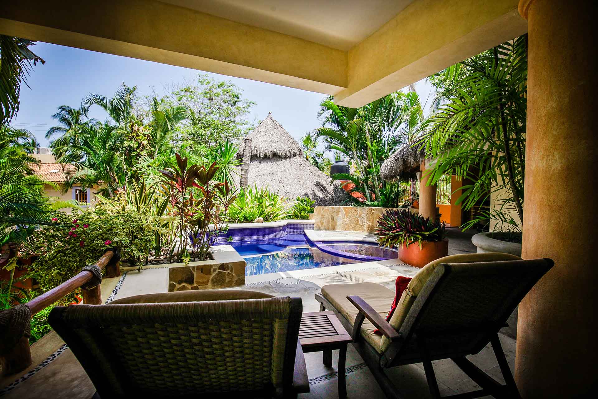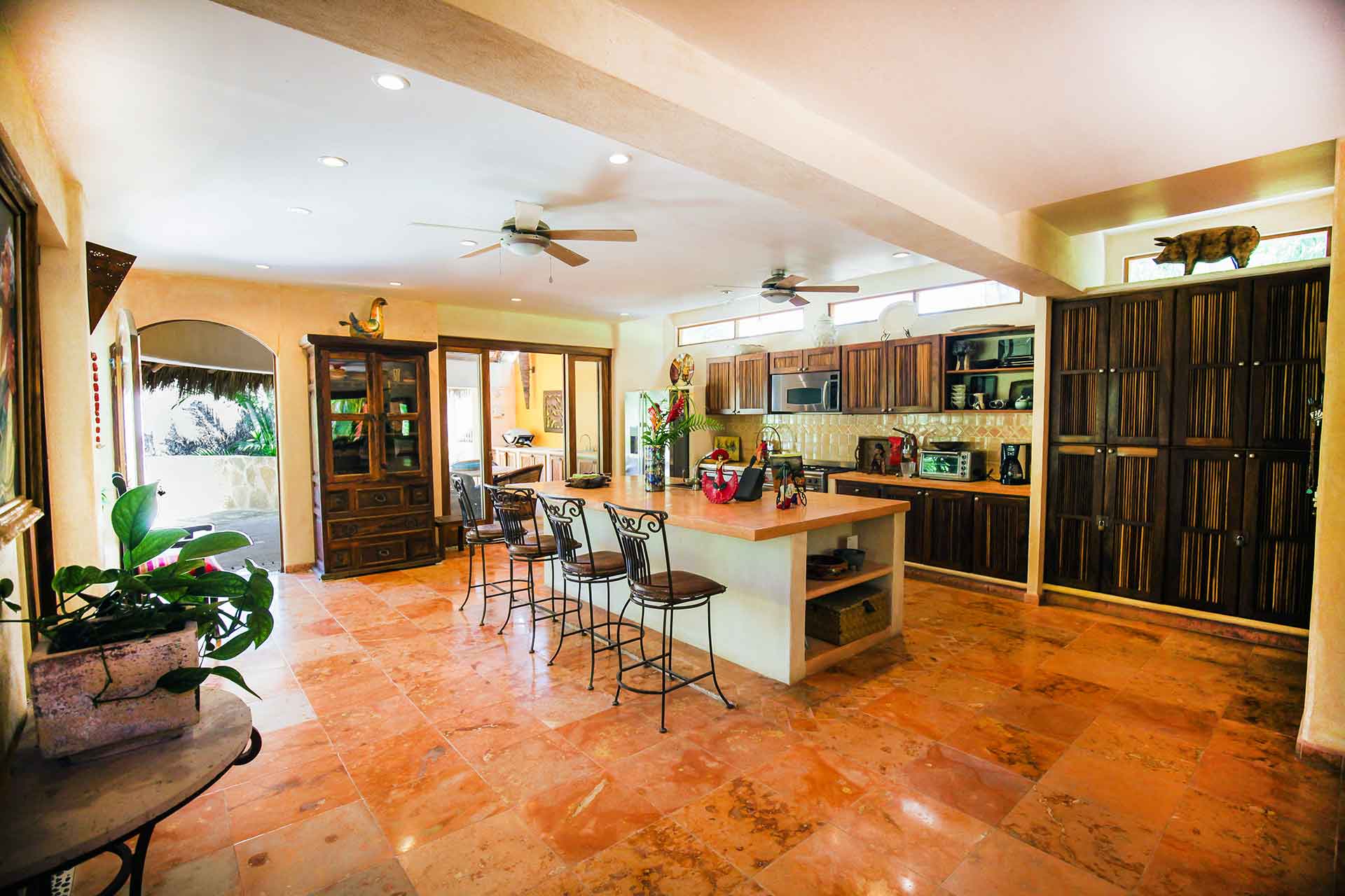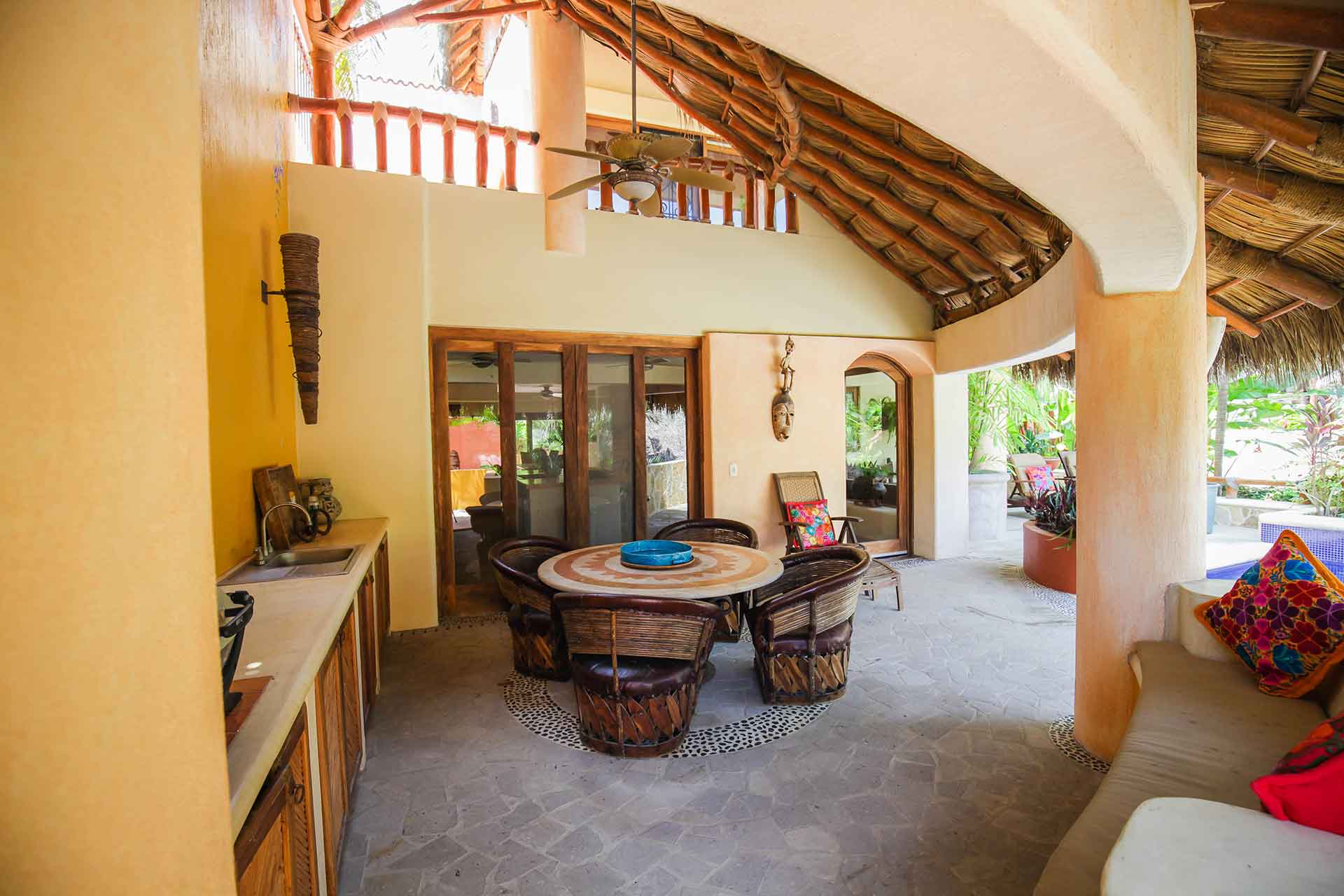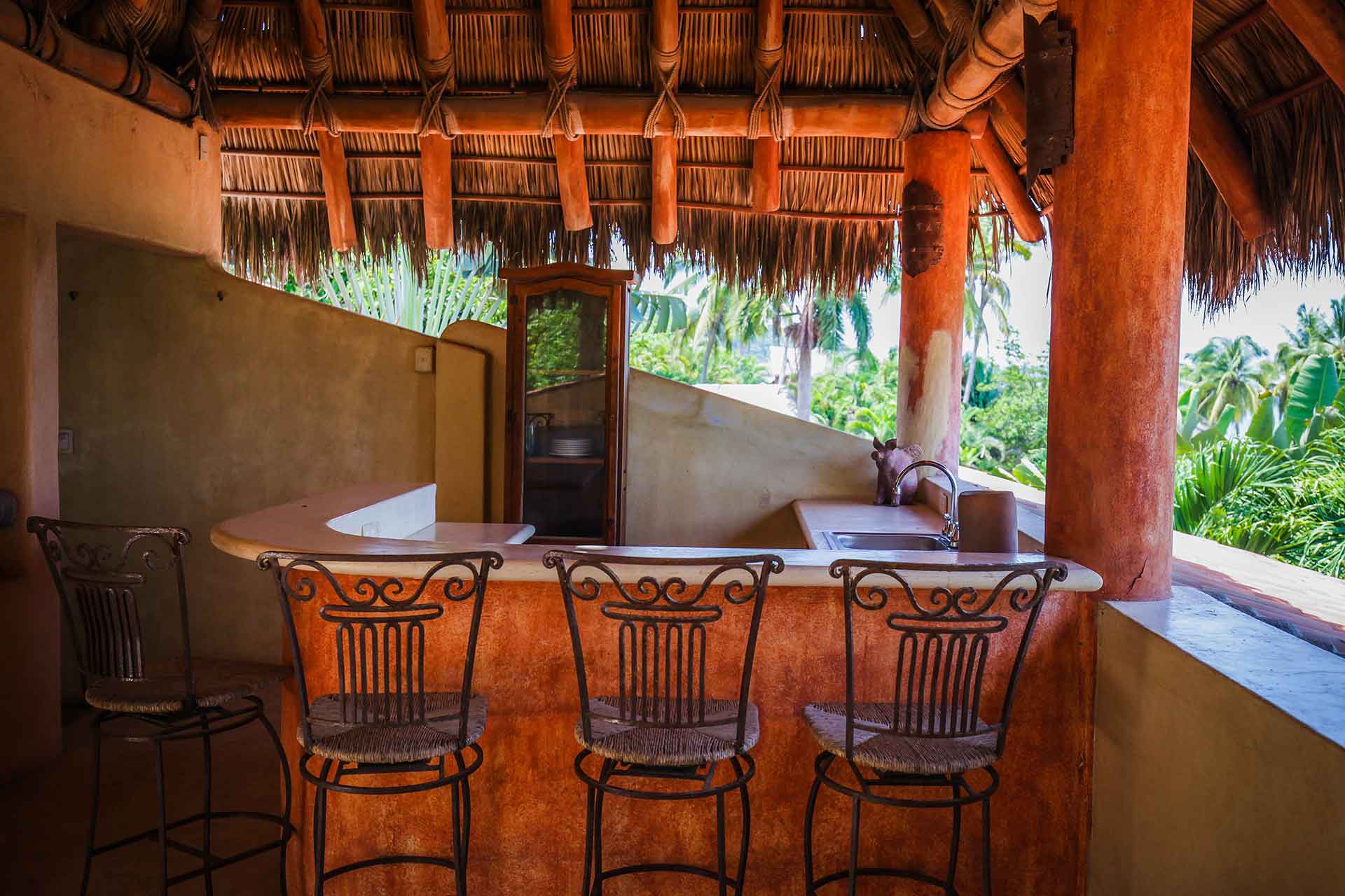 The rooftop, third level, covered by a palapa roof, is a magical place to enjoy your morning coffee or sip margaritas while viewing the breathtaking Pacific Ocean. This terrace encompasses a wet bar with mood lighting. Tropical birds provide constant music to the ear, as does the sound of the ocean just steps away.